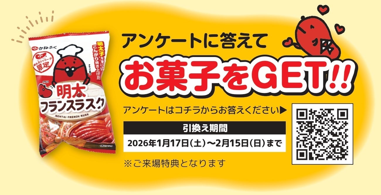 株式会社かねふく(所在地:福岡市東区馬出、代表取締役社長:竹内昌也)が運営する明太子専門のテーマパーク「めんたいパーク神戸三田」が、2015年3月のオープン以来、まもなく来場者1,000万人を達成します。日頃よりご愛顧をいただいております皆様に感謝の気持ちを込めて、1月17日(土)~2月15日(日)の期間中、来場者1,000万人達成イベントを開催します。