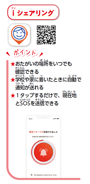 近年、急速なIT技術の促進によって、お子様の安全をもう一度考えなければいけないことも増えてきているかと思います。そのため、親だけでなく子供にも再度安全の意識を持ってほしいと考え、「iシェアリング」をリリースしておりました。