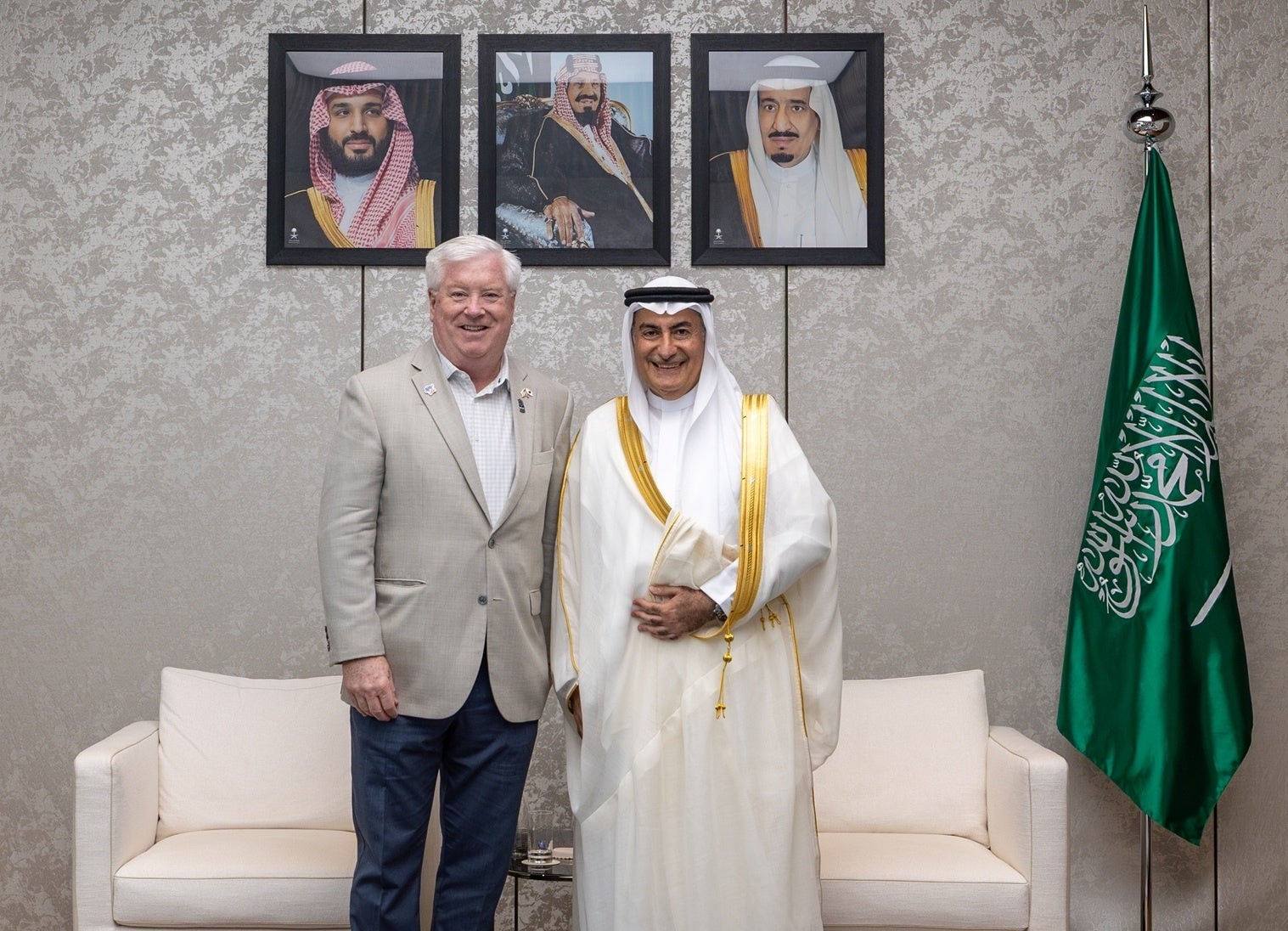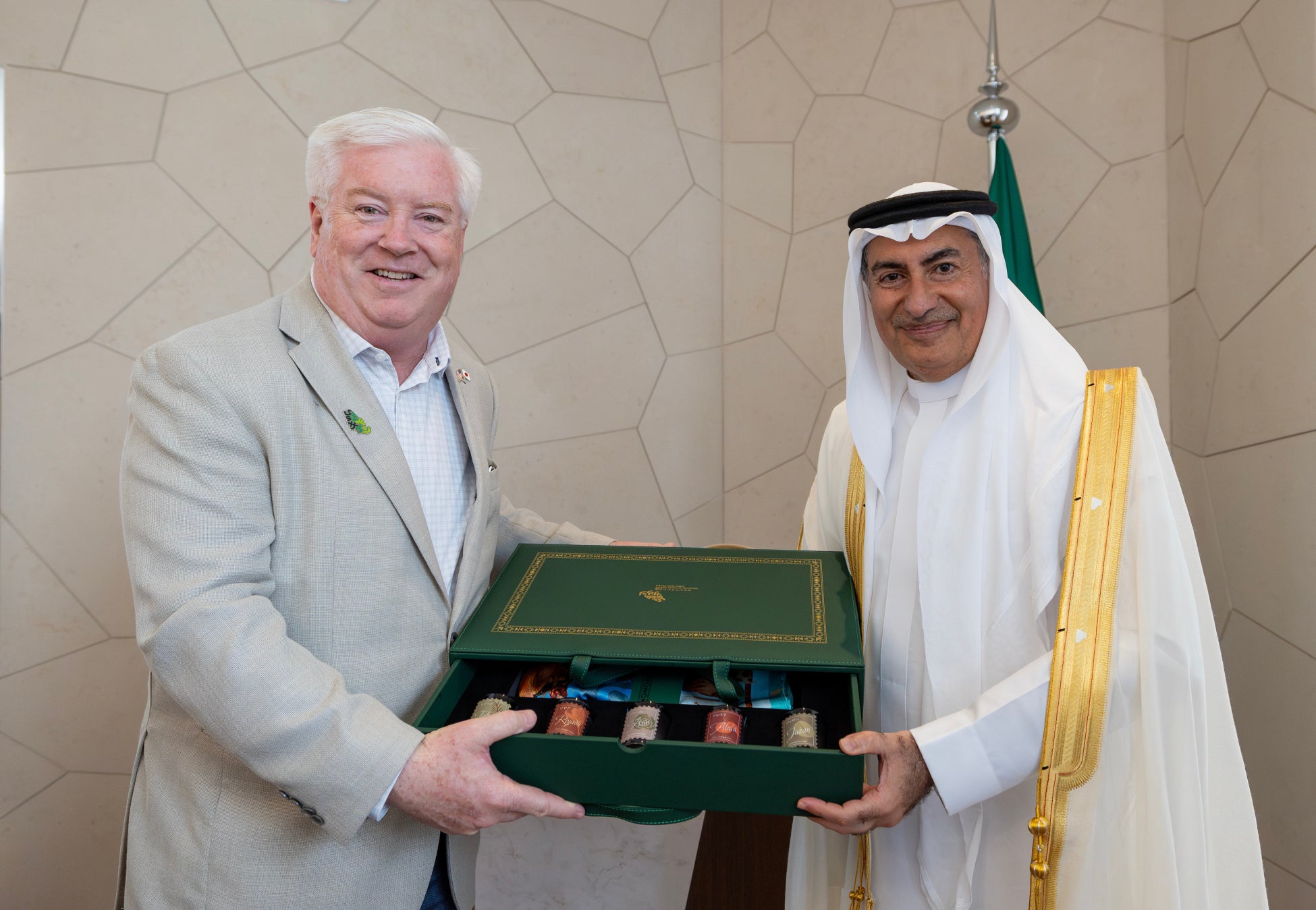 2025 年 5 月 23 日、ジョージ・グラス駐日米国大使は、2025 年大阪万博のサウジアラビア王国館において、ガーズィー・ビンザグル駐日サウジアラビア王国大使の温かい歓迎を受けました。