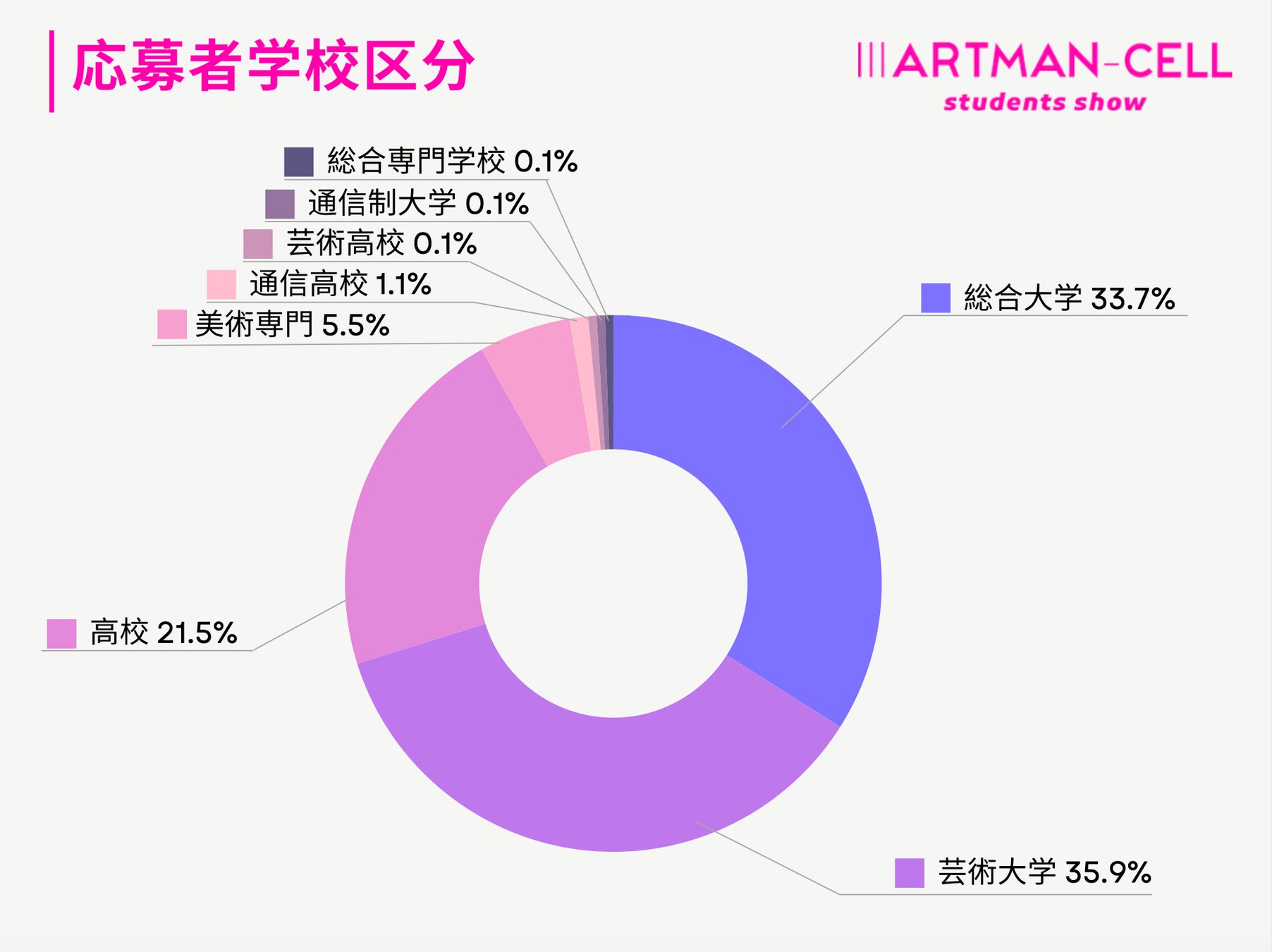 所属する学校の内訳は、芸術大学(35.9%)・総合大学(33.7%)・高校(21.5%)の3カテゴリが大部分を占める構成に。美術専門学校(5.5%)・通信制高校(1.1%)も含まれ、学びの形や地域性を問わない多様な背景が広がりました。