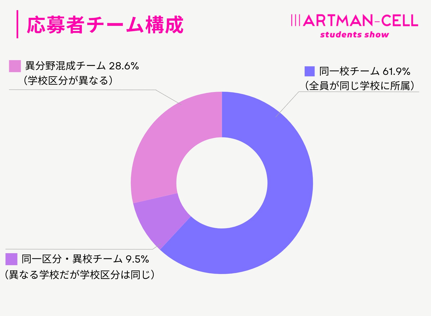 異なる学校に属しながらも同一の学校区分(例:美術大学)に属するチームが約10%、