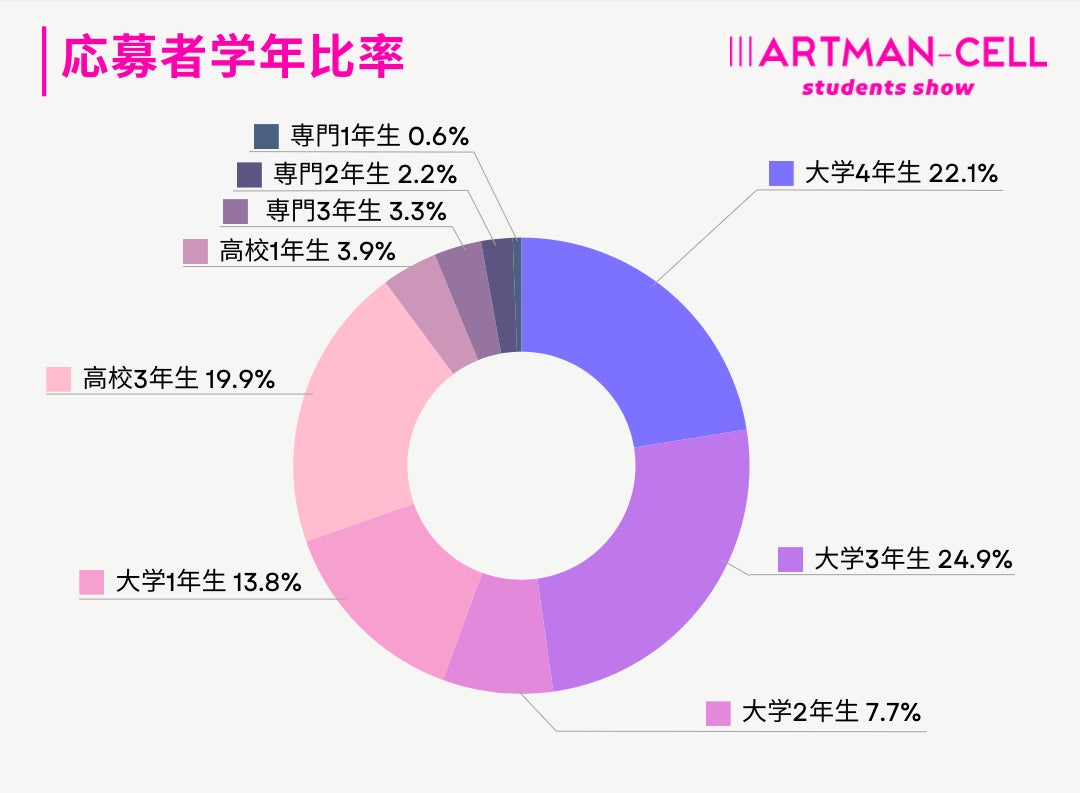 参加者の中心は大学3年(24.9%)、大学4年(22.1%)、高校3年(19.9%)で、進学・就職などの節目にあたる学年が全体の約67%を構成。大学1・2年生、専門学校生、高校1・2年生からの参加もあり、Z世代の中でも幅広い段階から、創造的なプロセスに呼応する層が集まりました。