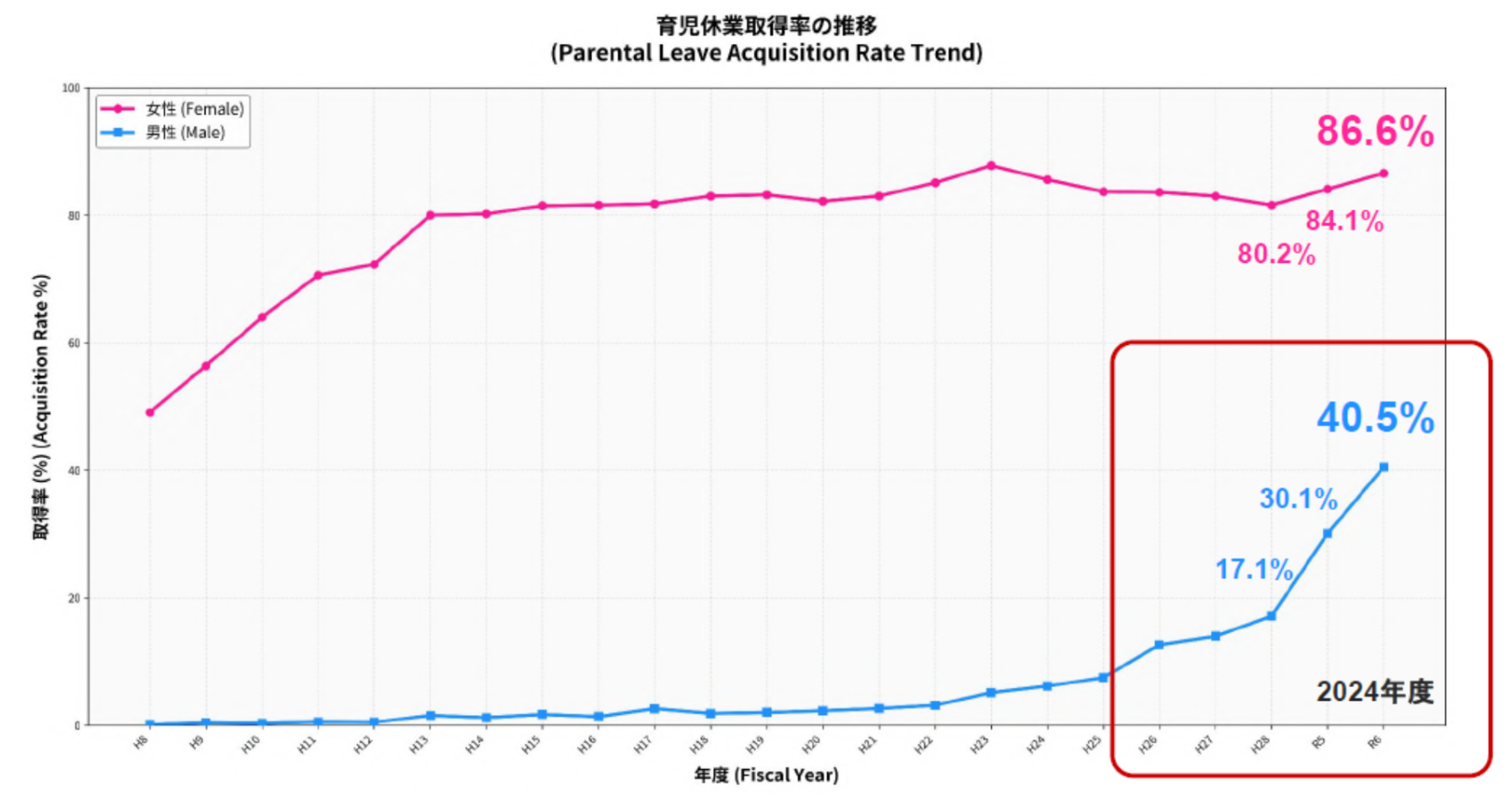 2024年度、民間企業における男性の育休取得率は40.5%に達し、前年度から10.4ポイントの大幅増となり、過去最高を更新しました。厚生労働省の調査により、2年連続で10ポイント以上の増加となり、育休は「特別なもの」から「当たり前の権利」へと急速に変化しています。