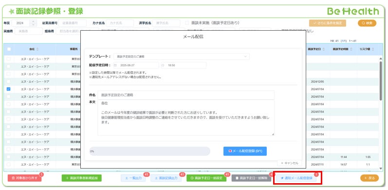これまで受診勧奨通知機能とストレスチェック機能にはメール配信機能がついていましたが、今回のバージョンアップにより、面談記録、健診結果詳細、残業時間、就業判定画面からもメール配信が可能となりました。この機能により、面談記録画面では面談予定者へのメール通知、残業時間画面では長時間労働者への注意喚起メールなどを送ることが可能となります。