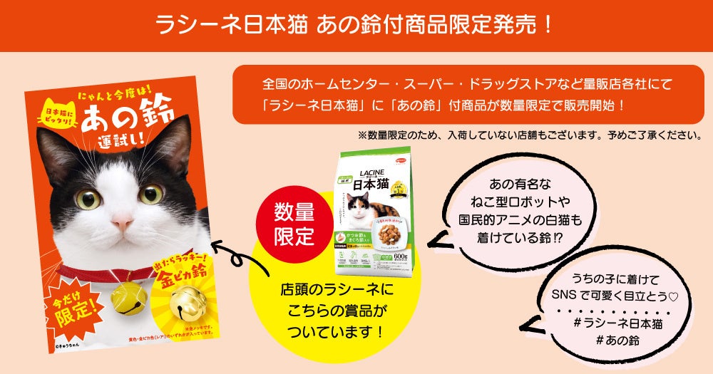 日本猫のためのフード「ラシーネ日本猫」ご購入レシートで、金のあの鈴(素材:18K)他、もらって嬉しい賞品が当たるチャンス!WEBからカンタン応募!締切は11月30日(日)まで。今すぐチェック!