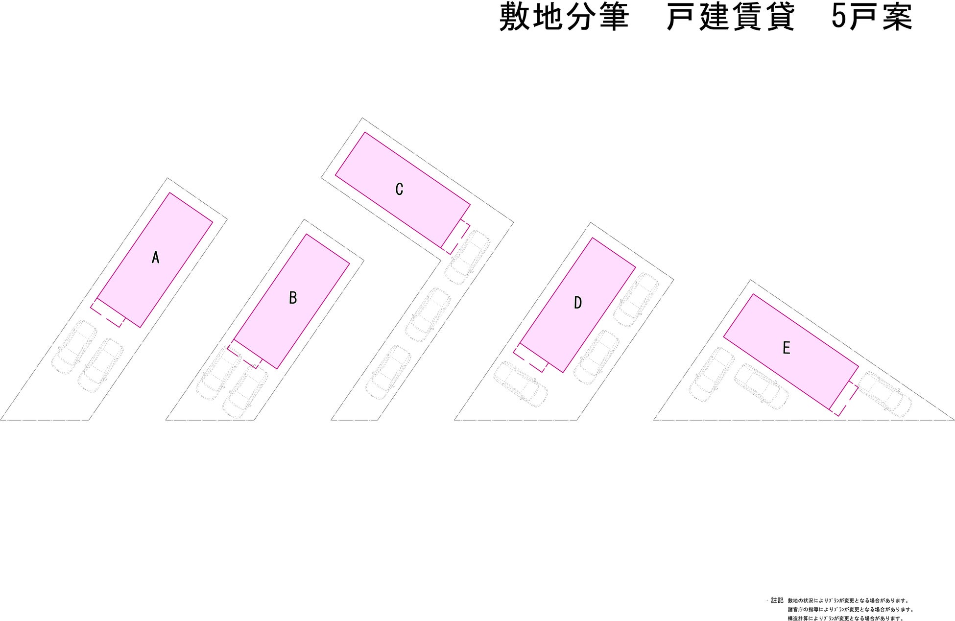 目 的 : 変形敷地等でマンション等が入らない場合の土地活用や、相続時に円滑な分筆を行うため。 特 徴 : 間口が4095mmでどんな敷地形状でも合わせやすい。アパート/マンション+αの余った敷地にも入る場合がある。デザイン性が高く、数棟並ぶことで都市景観にも配慮。
