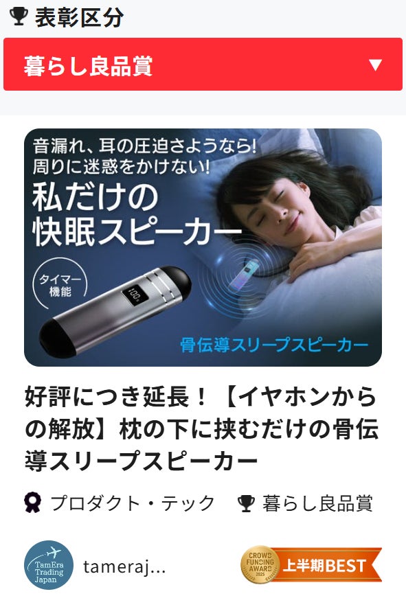 このたび、TamEra Trading Japan合同会社(以下、当社)が展開する骨伝導スリープスピーカーが、「クラウドファンディングアワード2025」〈暮らし良品賞 上半期BEST〉に選出されました。