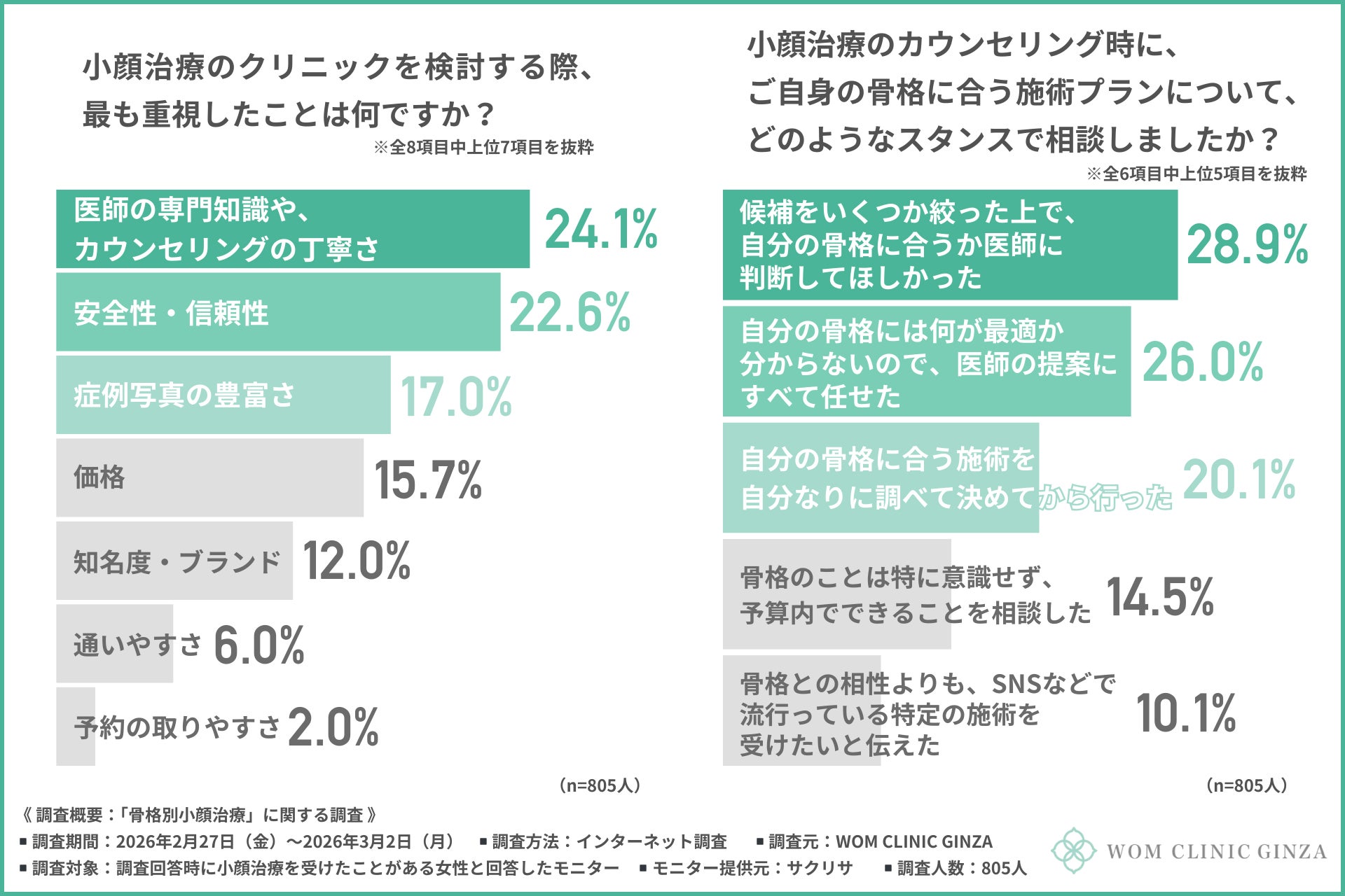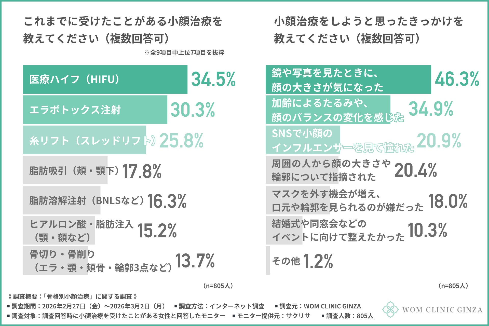 WOM CLINIC GINZA(所在地:東京都中央区、理事長:深堀 純也)は、小顔治療を受けたことがある女性を対象に、「骨格別小顔治療」に関する調査を行いました。