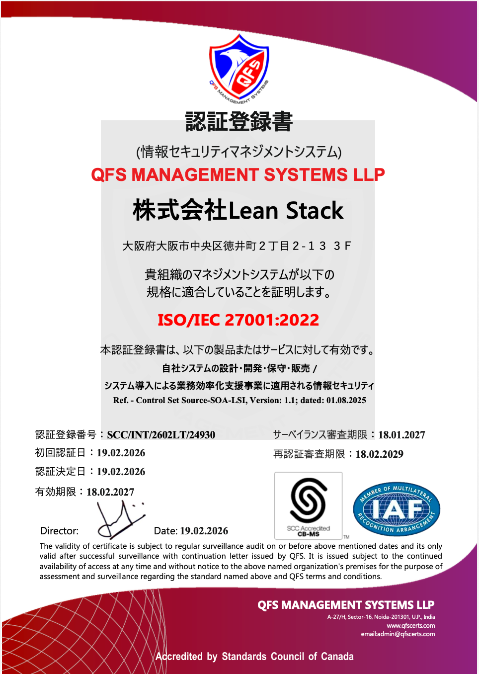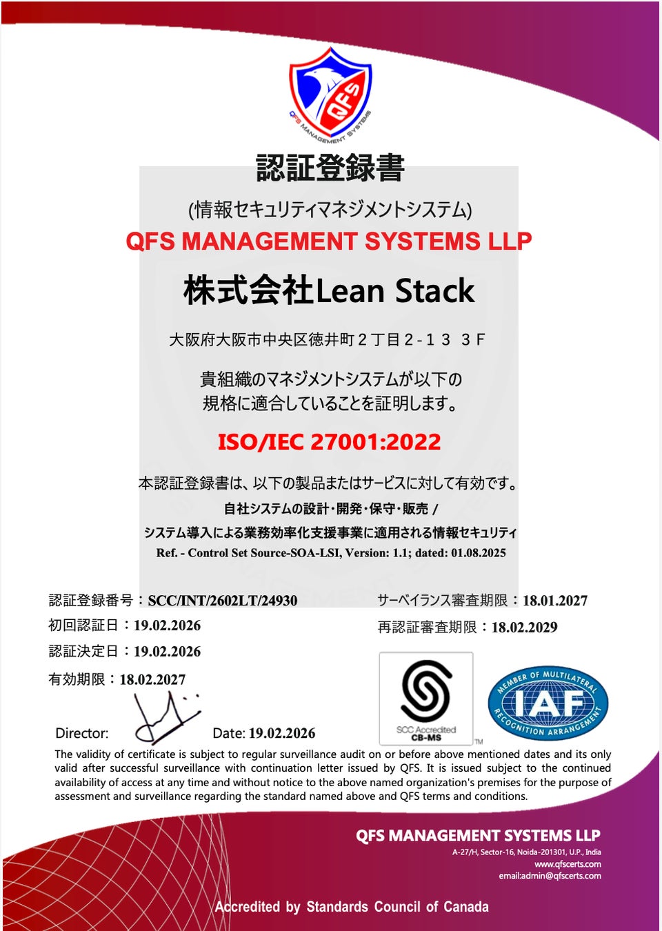審査機関:QFS MANAGEMENT SYSTEMS LLP