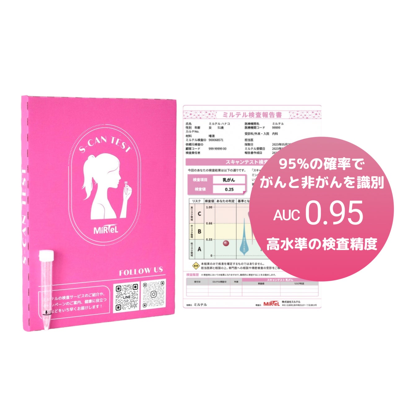 ミルテルの「スキャンテスト 乳がん」は、唾液を採取するだけで乳がんのリスクを簡便に把握できる検査サービスです。手軽さと非侵襲性(痛みや負担の少なさ)により、検査を受ける心理的ハードルを下げ、乳がん検診の受診率向上や早期発見の促進に貢献します。