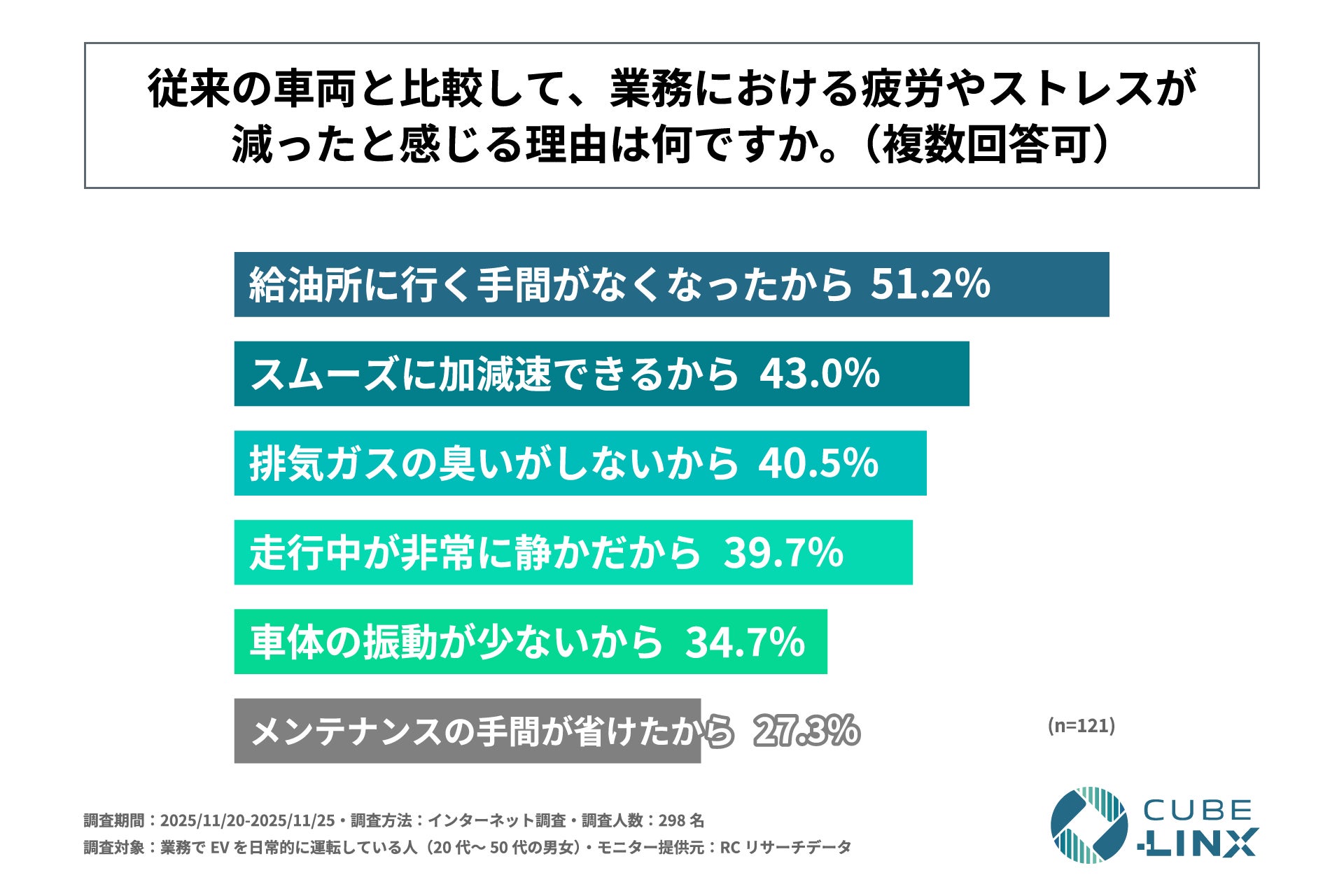 ・従来の車両に比べ、EVを運転することで業務上の疲労やストレスが減ったと感じる主な理由は、「給油所に行く手間がなくなったから」や「スムーズに加減速できるから」