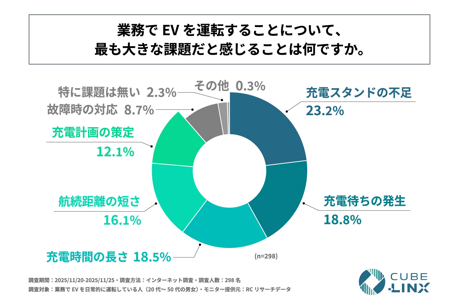 調査の最後、業務でEVを日常的に運転している人を対象に「業務でEVを運転することについて、最も大きな課題だと感じることは何か」を尋ねる設問への回答では、1位が「充電スタンドの不足」で23.2%、2位が「充電待ちの発生」で18.8%、3位が「充電時間の長さ」で18.5%という結果になりました。この結果から、業務でEVを運転することについて最も大きな課題だと感じることは「充電スタンドの不足」であることがわかりました。
