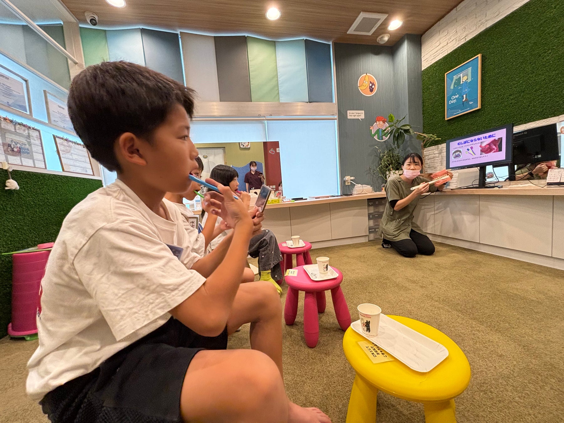 同年代のお子さまたちと一緒に、楽しく歯磨きをしながら、お口の健康だけでなく体全体の健康につながる知識を学びます。お子さま自身が正しい歯磨き方法を身に着けることで、毎日の習慣づけがスムーズになり、保護者の方の仕上げ磨きの負担軽減にもつながります。