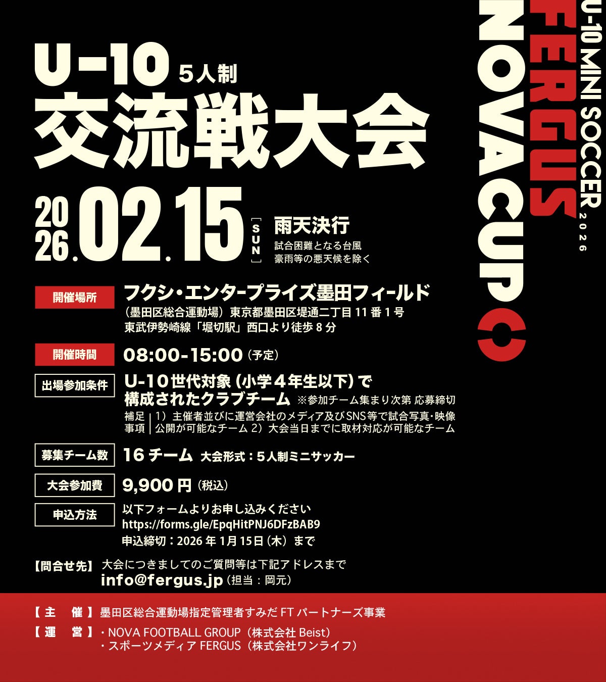 この度、CFビラノバジャパンの拡張組織であるNOVAフットボールグループでは、スポーツメディアFERGUS/株式会社ワンライフ(https://fergus.jp/)と、墨田区総合運動場指定管理者すみだFTパートナーズ事業とともに、U-10世代を対象としたサッカー大会『FERGUS NOVA CUP』を2026年2月15日(日)に開催いたします。