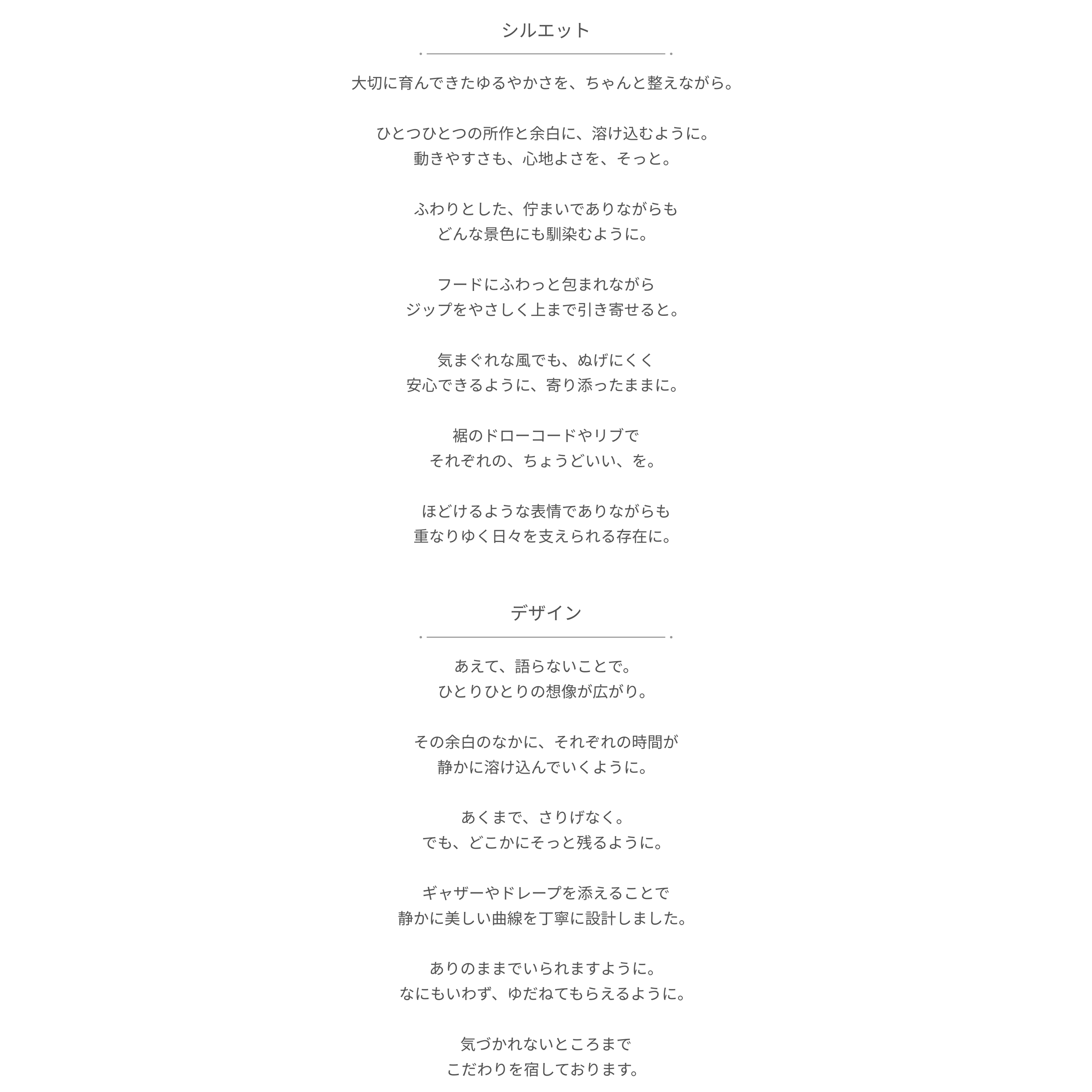 「大切なあなた」と「あなたの大切な人」を、ちゃんと守れるように。紫外線防止指数の最高レベル【UPF50+】に。撥水加工、と。抗菌防臭のやさしさを添えて、いつまでも心地いいユルさを。