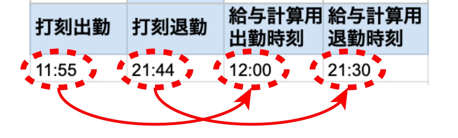 ★給与計算用出勤(及び退勤)時刻(中途半端な出勤時間を15分刻みで繰り上げor繰り下げするルールを適用可能)