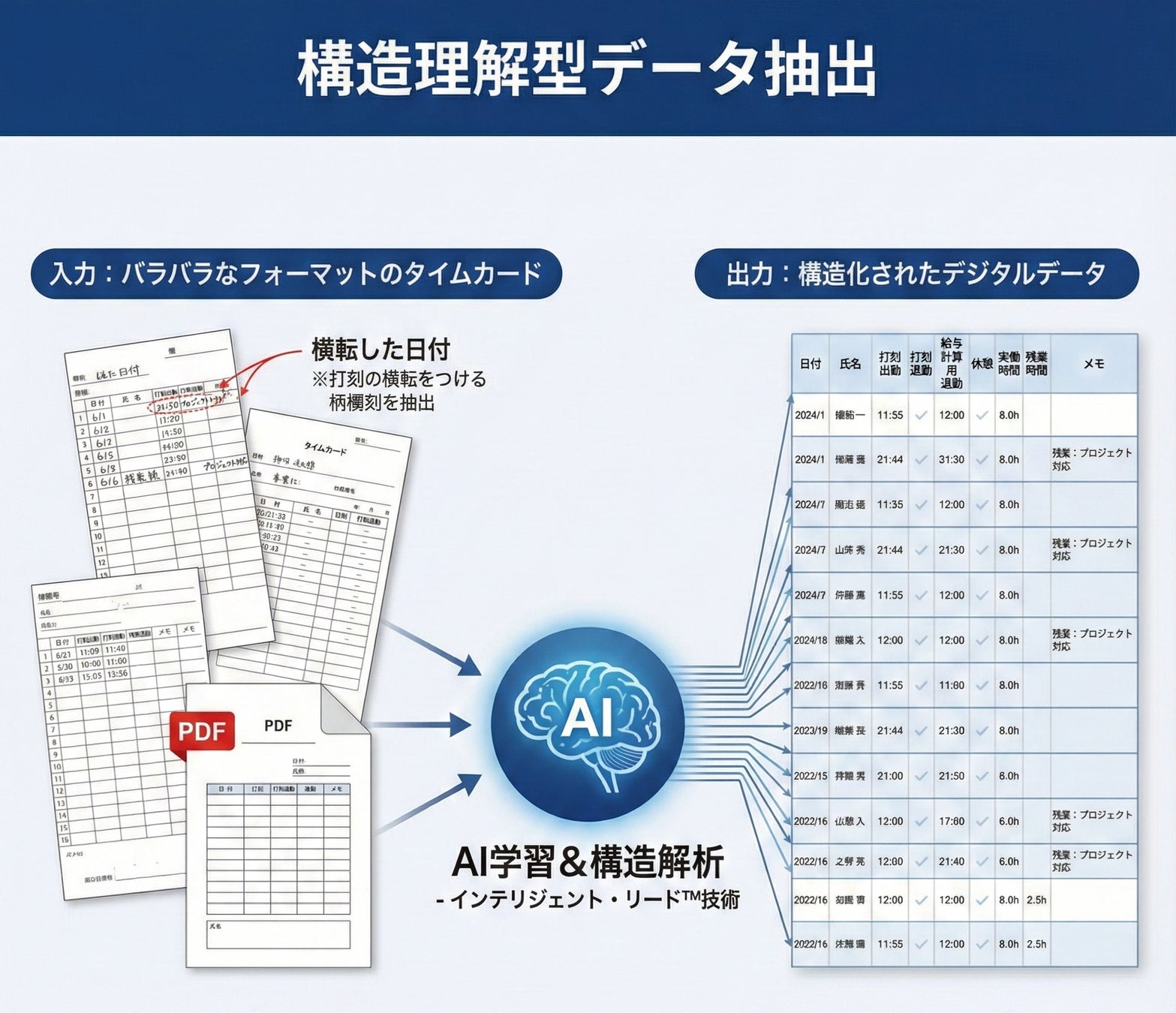 最大の特徴は、企業ごとに異なるタイムカードのフォーマットや表記ルールをAIが学習し、その上でOCR処理を行う点です。