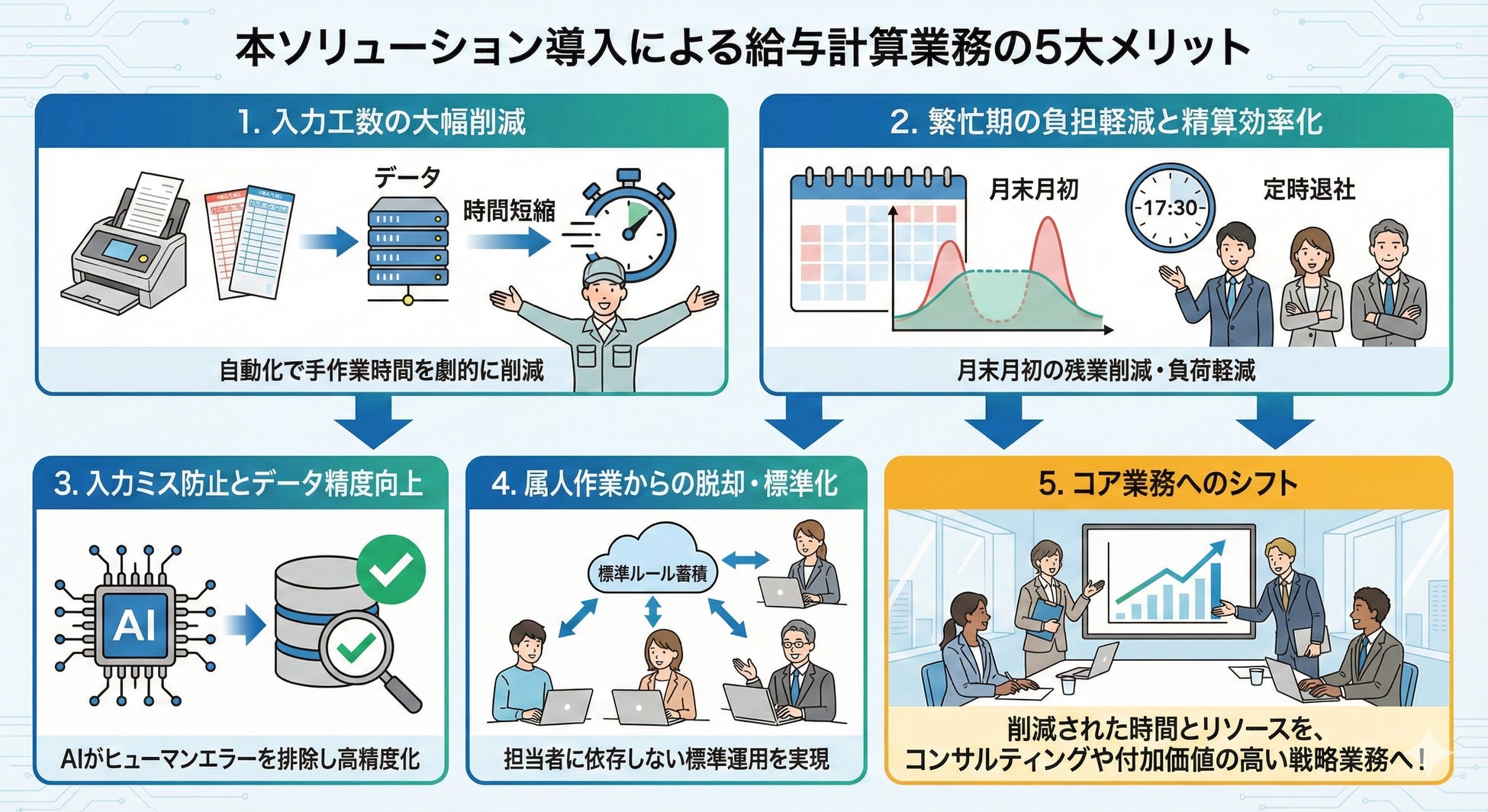 本ソリューションを導入することで、給与計算業務には次のようなメリットがあります。
