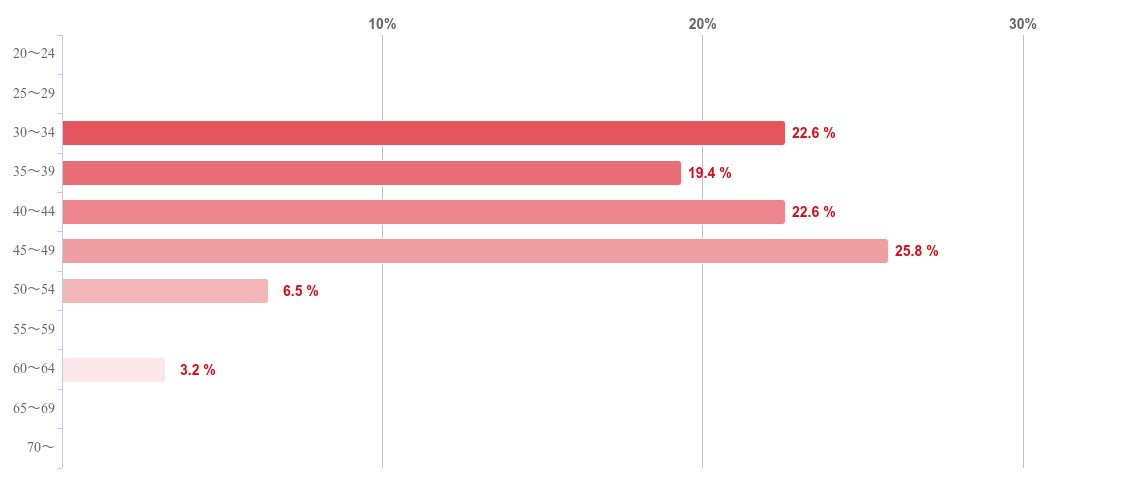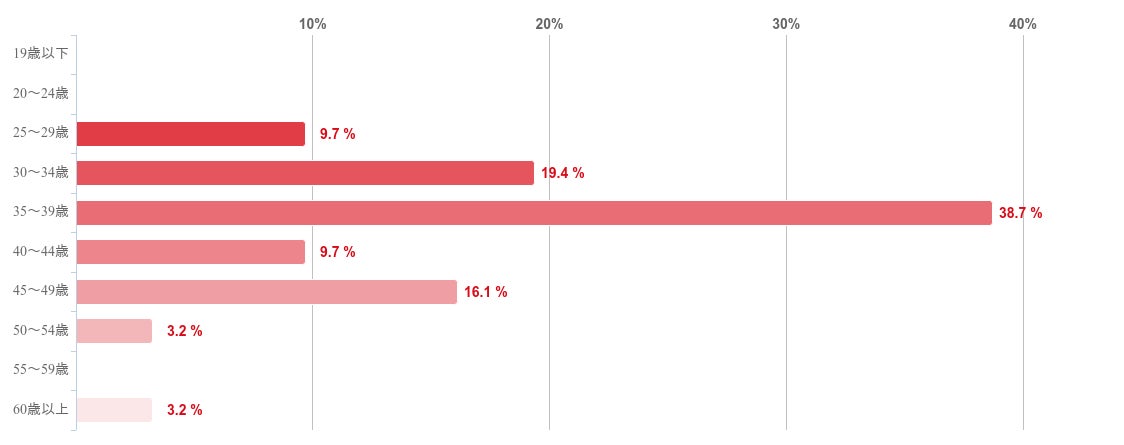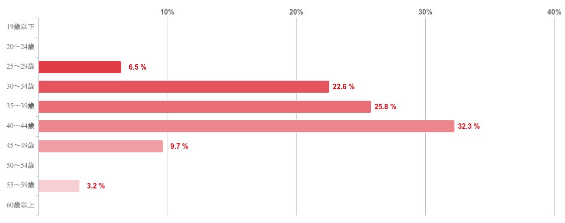 「40〜44歳」と回答した人が32.3%で最も多く、次いで「35〜39歳」(25.8%)、「30〜34歳」(22.6%)という順となった。