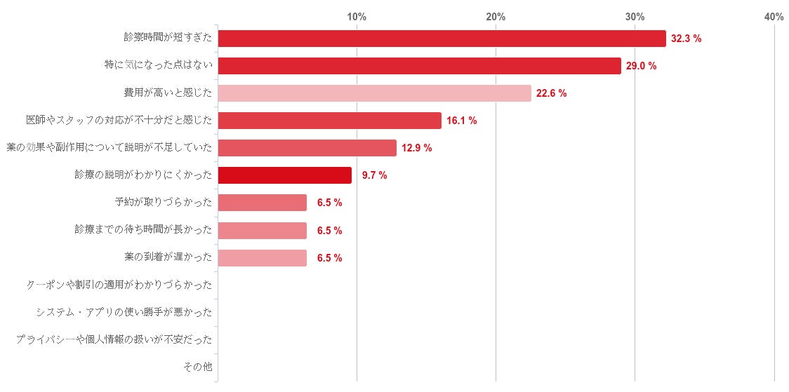 「診察時間が短すぎた」と回答した人が32.3%で最も多かったが、「特に気になった点はない」と回答した人も29.0%だった。