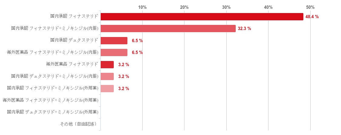 「国内承認 フィナステリド」と回答した人が48.4%、次いで「国内承認 フィナステリド+ミノキシジル(内服)」が32.3%で続き、この二つの回答が多い結果となった。