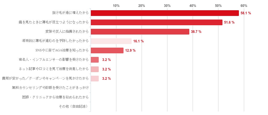 そのほか、「家族や友人に指摘されたから」や「将来的に薄毛が進むのを予防したかったから」、「SNSや広告でAGA治療を知ったから」という回答も一定数集まった。