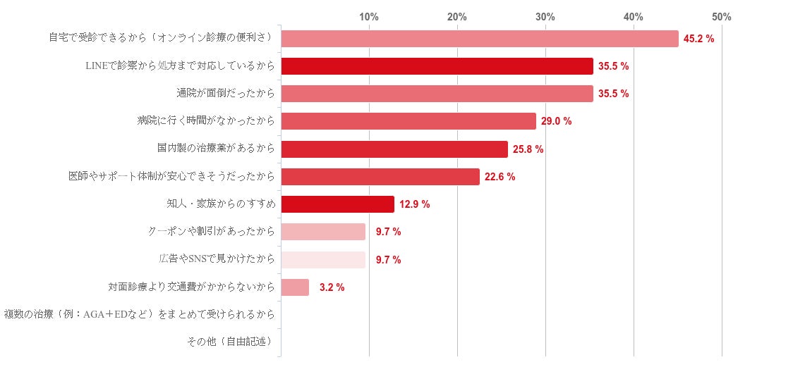 「自宅で受診できるから(オンライン診療の便利さ)」と回答した人が45.2%で最も多く、次いで「LINEで診察から処方まで対応しているから」と「通院が面倒だったから」が同率で35.5%、「病院に行く時間がなかったから」が29.0%という順になった。