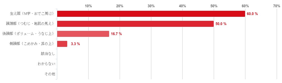 「生え際(M字・おでこ周辺)」と回答した人が60.0%と最も多く、次いで「頭頂部(つむじ・地肌の見え)」が50.0%で続いた。