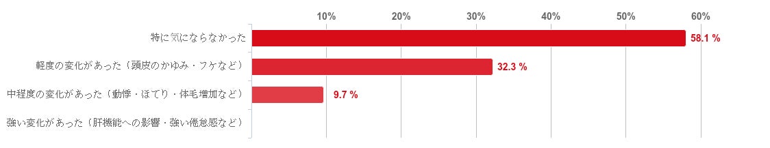そのほか、「軽度の変化があった(頭皮のかゆみ・フケなど)」と回答した人は32.3%、「中程度の変化があった(同期・ほてり・体毛増加など)」と回答した人は9.7%と僅かで、「強い変化があった(肝機能への影響・強い倦怠感など)」と回答した人はいなかった。