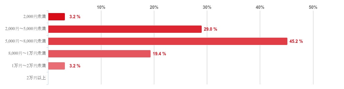 また、「8,000円~1万円未満」も19.4%と一定数みられたが、「2,000円未満」や「1万円~2万円未満」(3.2%)との回答は僅かとなり、2万円以上と回答した人はいなかった。