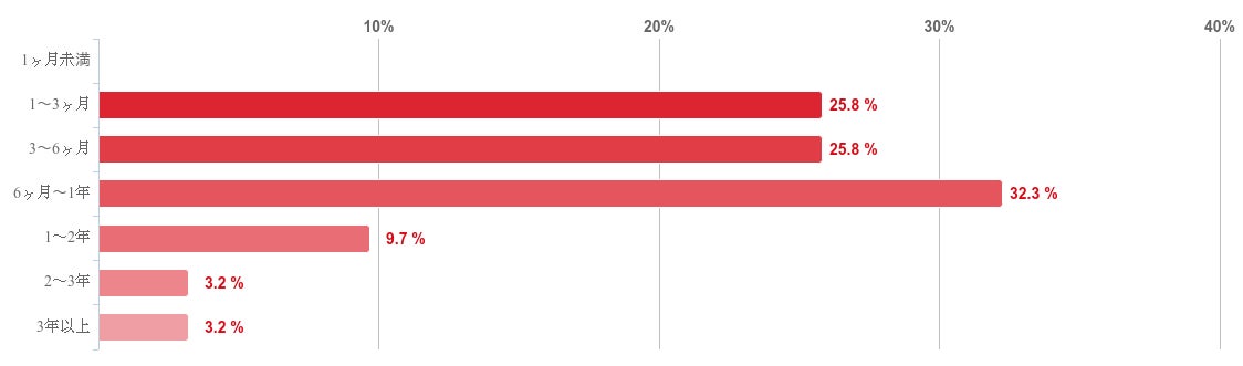 「6ヶ月~1年」が32.3%と最も多く、「1~3ヶ月」と「3~6ヶ月」が25.8%で続き、1ヶ月から1年未満の人が多くの割合を占めた。