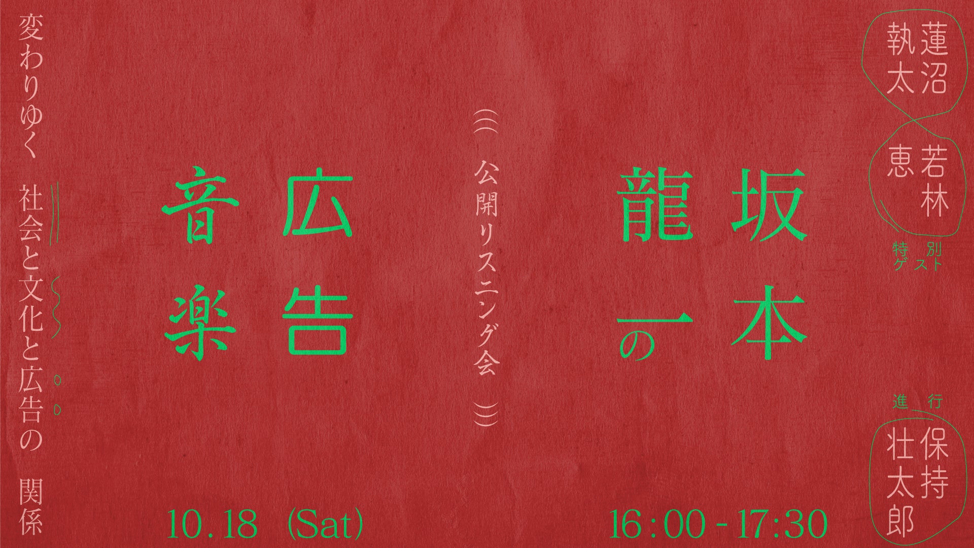 1977年、若き坂本龍一が最初に取り組んだ仕事の一つがCM音楽だった。「丸井のメガネ」にはじまり、数多くの広告音楽を手掛け、やがては出演者としても登場する。2000年代以降は社会問題に目を向け、自身と広告との関わりを問い直していった。本セッションでは、特別ゲストに蓮沼執太、若林恵を迎え、CD化されていない音源を含む坂本の広告音楽作品を聴きながら、各時代における広告と文化、社会との関係を語っていく。