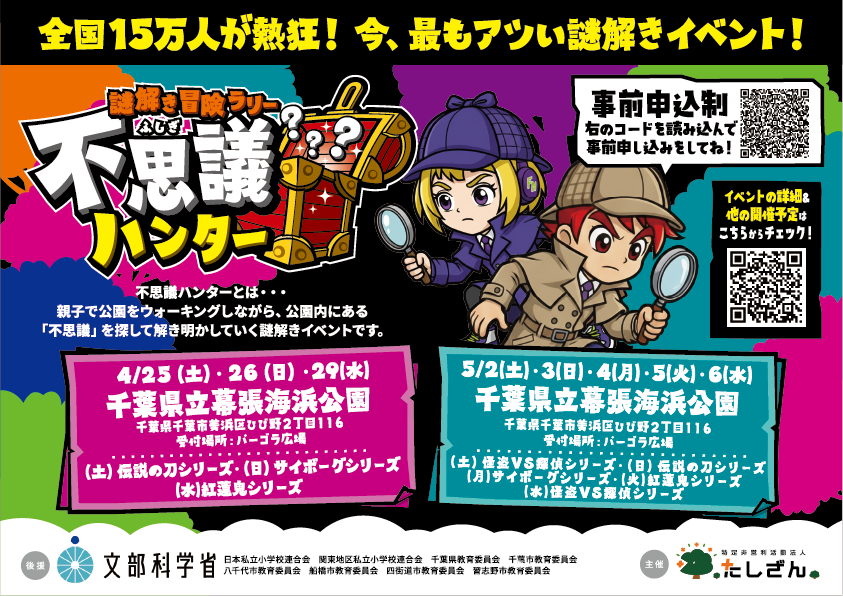 親子で楽しむ謎解きイベント「不思議ハンター」が、千葉県内の公園で4月~5月に開催。「伝説の刀」「怪盗VS探偵」など新シリーズが続々登場。親子で学び体験できる冒険型謎解きイベントです!