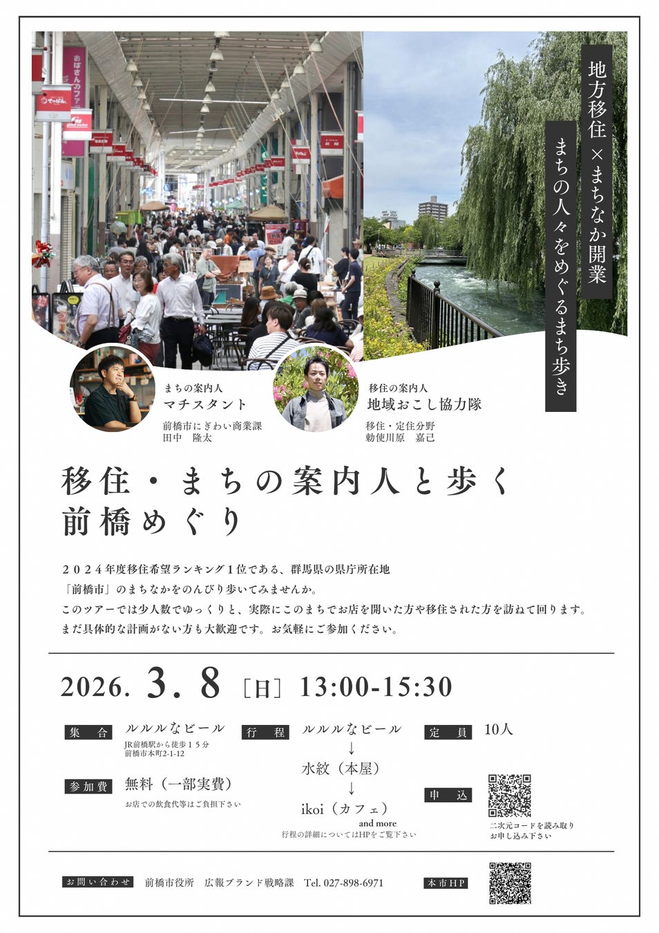前橋市は、移住を検討されている方を対象に、案内人とまちなかをのんびり歩きながら、実際の暮らしに触れるイベント『移住・まちの案内人と歩く前橋めぐり(以下 本イベント)』を、2026年3月8日(日)に開催します。 現在、本イベントの参加者を募集しております(定員10名程度・抽選制)。