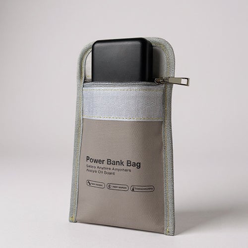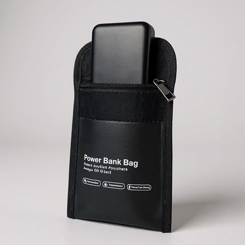 近年増加するモバイルバッテリー等の発火や発熱、万一の事故による被害を抑制することを目的に、毎日持ち歩ける「防災」アイテムとして開発されたのが「モバイルバッテリー用 燃えにくいケース」です。外層にシリコンコートとガラス繊維布、内層にガラス繊維布とアルミ箔を重ね、内外部からの熱を防ぐ4層構造で燃えにくい設計を採用し、最大800℃の耐熱性能を備えています。