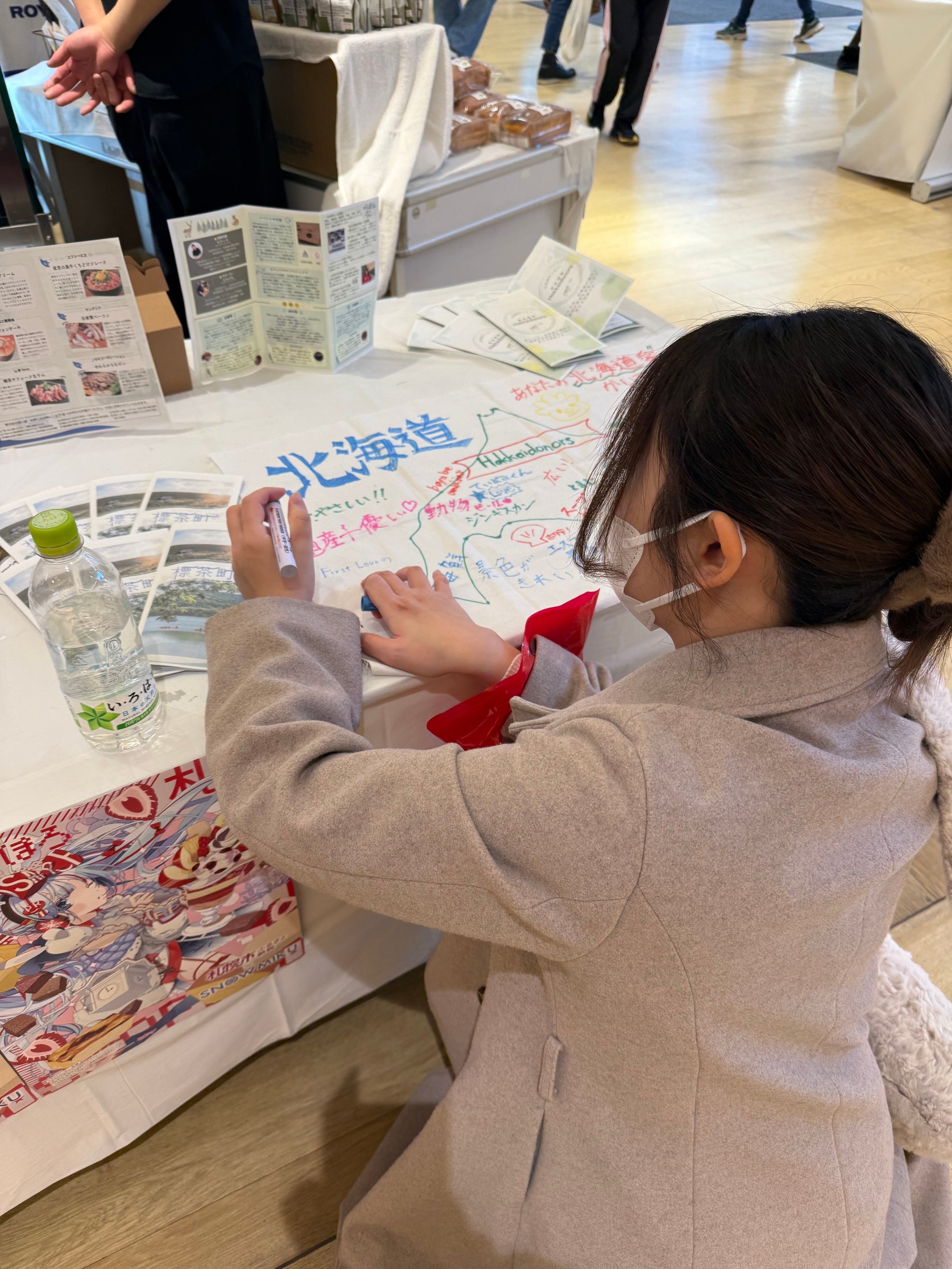 また、来場者参加型企画として、北海道への想いや好きな地域、おすすめの食べ物などを自由に書き込める北海道マップを設置しました。学生との会話をきっかけに多くの来場者が参加し、会場には北海道への温かいメッセージが集まりました。