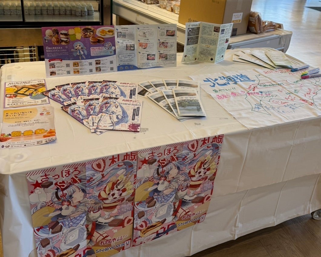 北海道の食・観光・文化をテーマにした学生主体のPOPUPで、規格外野菜を活用したパウンドケーキや北海道素材の商品を販売。来場者が北海道の“推し”を書き込める参加型マップ企画も実施。