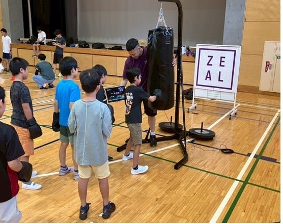 ボクシング教室では、基本的な構え、動きに加え、サンドバックに付けたセンサーで衝撃の強さや叩いた回数を計測しました。