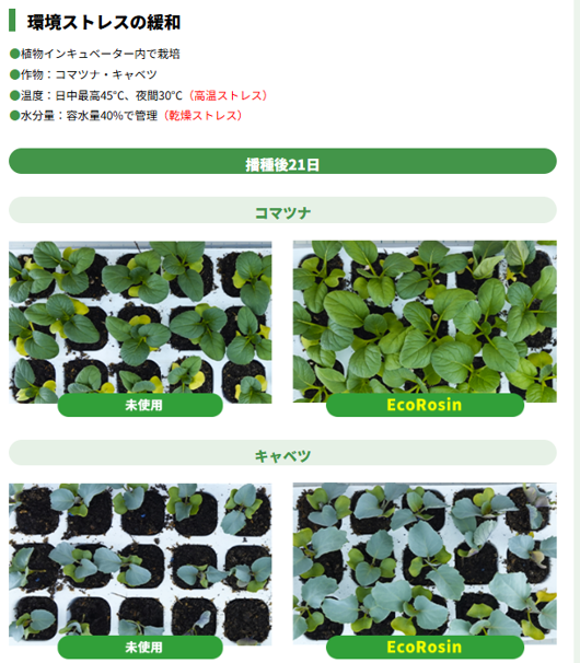 「高温」「乾燥」などの環境が変化しても「いつも通りに取れる」、「たくさん取れる」を実現する、松の力を科学的に立証した農業資材