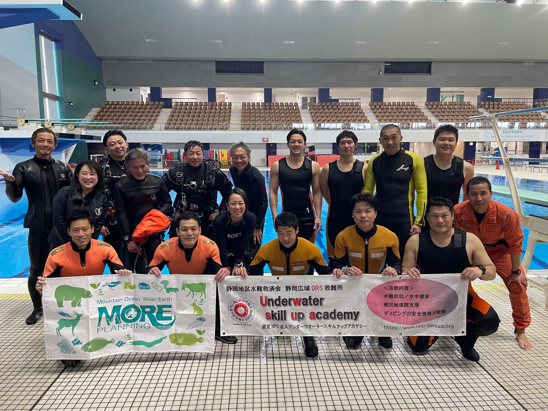 本訓練は、実際の水難救助現場で経験を積んできた専門家4名(認定NPO法人アンダーウオータースキルアップアカデミー所属、以下U.W.S.U.A)と、MORE企画により訓練指導が行われました。