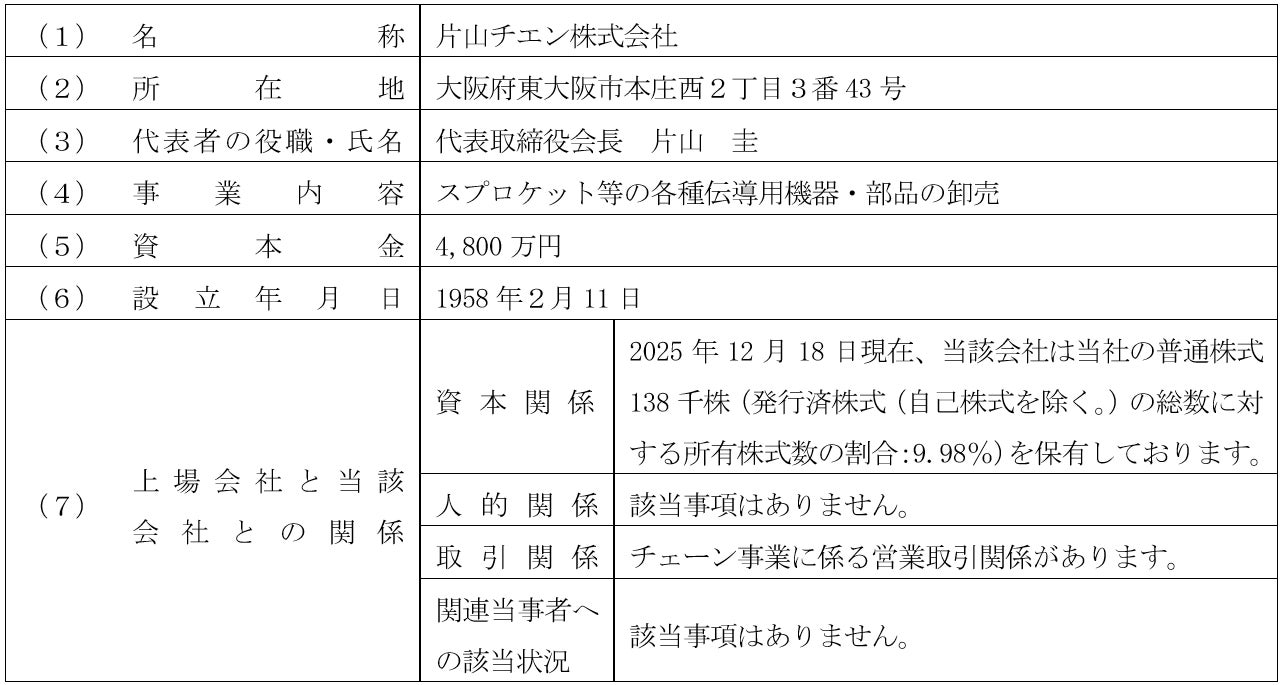当社は、2025 年12 月18 日付の適時開示「4社間業務提携に関するお知らせ」にて公表しておりました片山チエン株式会社(以下、「KANA」という。)、アールケー・ジャパン株式会社(以下、「RK」という。)、加賀工業株式会社(以下「KCM」という。)との業務提携契約について、本日、当該契約を締結いたしましたので下記のとおり、お知らせいたします。