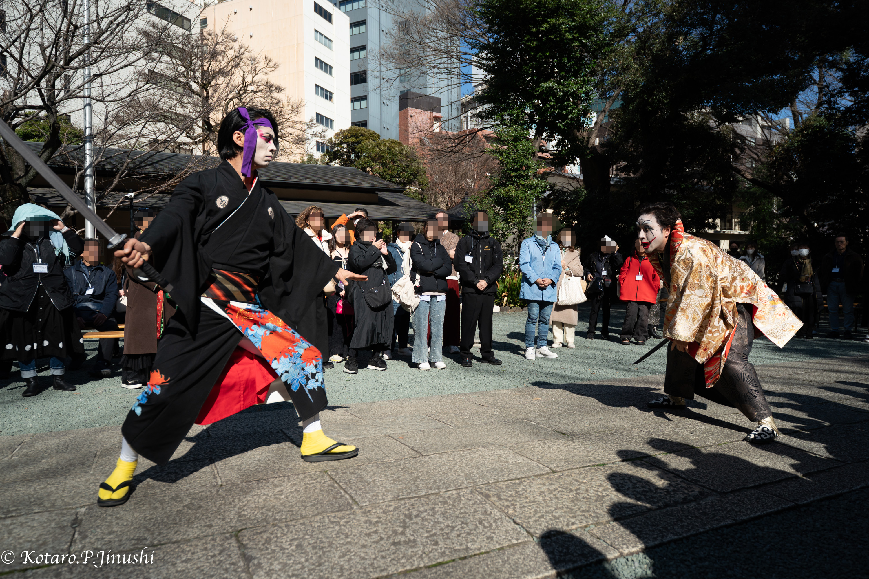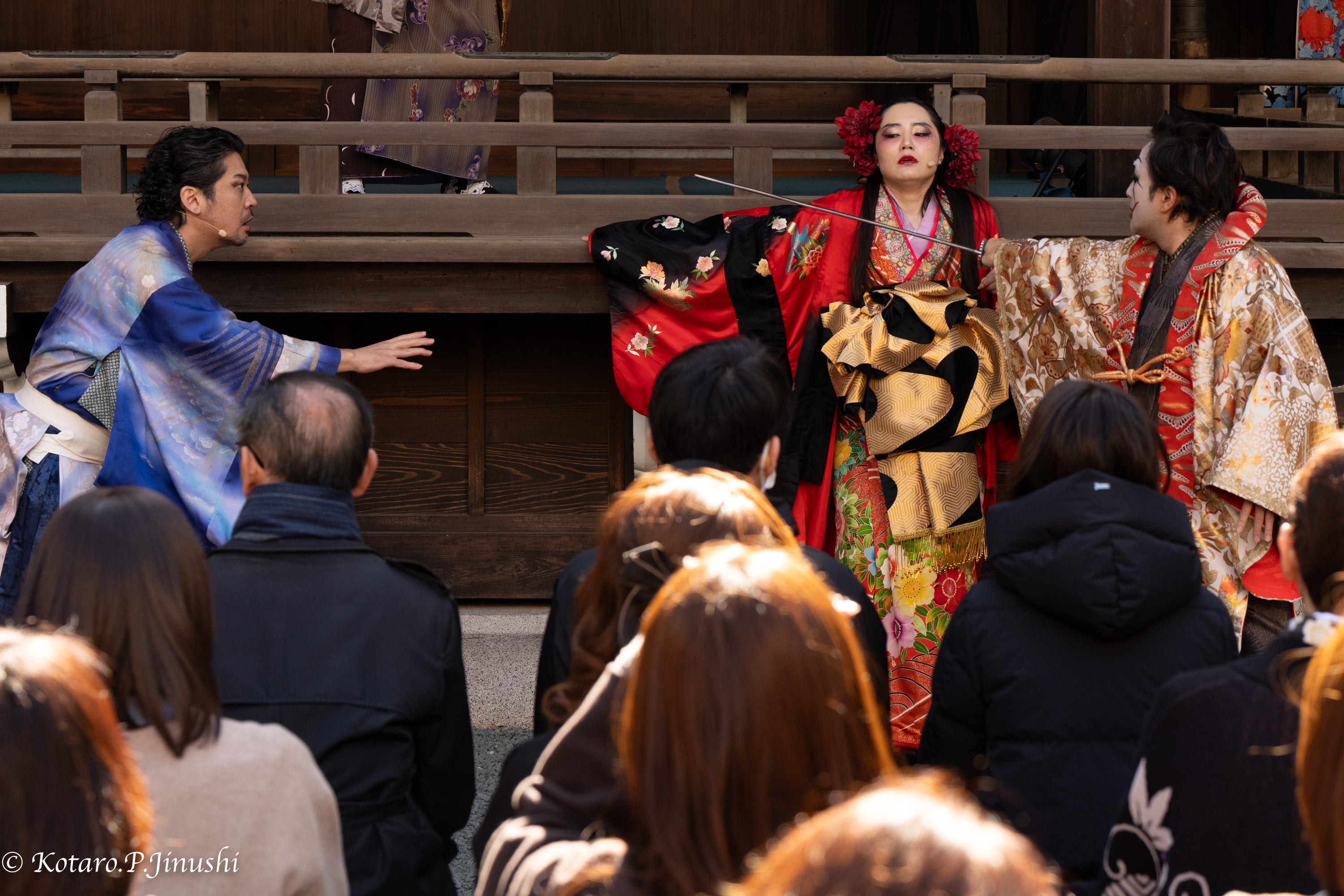 イタリアオペラの名作「パリアッチ(道化師)」と、日本の伝統芸能である歌舞伎の代表作「助六」を融合させた本公演は、千年の歴史を誇る金王八幡宮の境内を舞台空間として活用し、観客が演者とともに移動しながら物語を体験する、全く新しいスタイルのエンターテインメントをお届けしました。