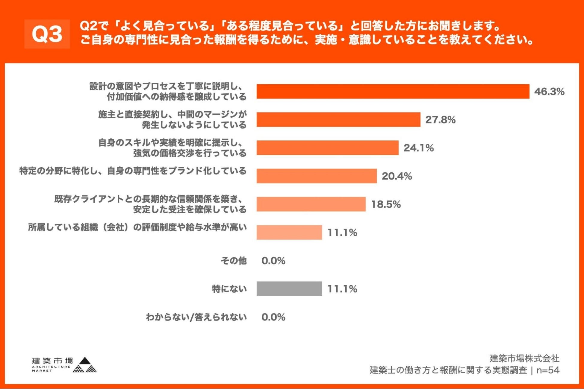 「Q3. Q2で「よく見合っている」「ある程度見合っている」と回答した方にお聞きします。ご自身の専門性に見合った報酬を得るために、実施・意識していることを教えてください。(複数回答)」(n=54)と質問したところ、「設計の意図やプロセスを丁寧に説明し、付加価値への納得感を醸成している」が46.3%、「施主と直接契約し、中間のマージンが発生しないようにしている」が27.8%、「自身のスキルや実績を明確に提示し、強気の価格交渉を行っている」が24.1%という回答となりました。