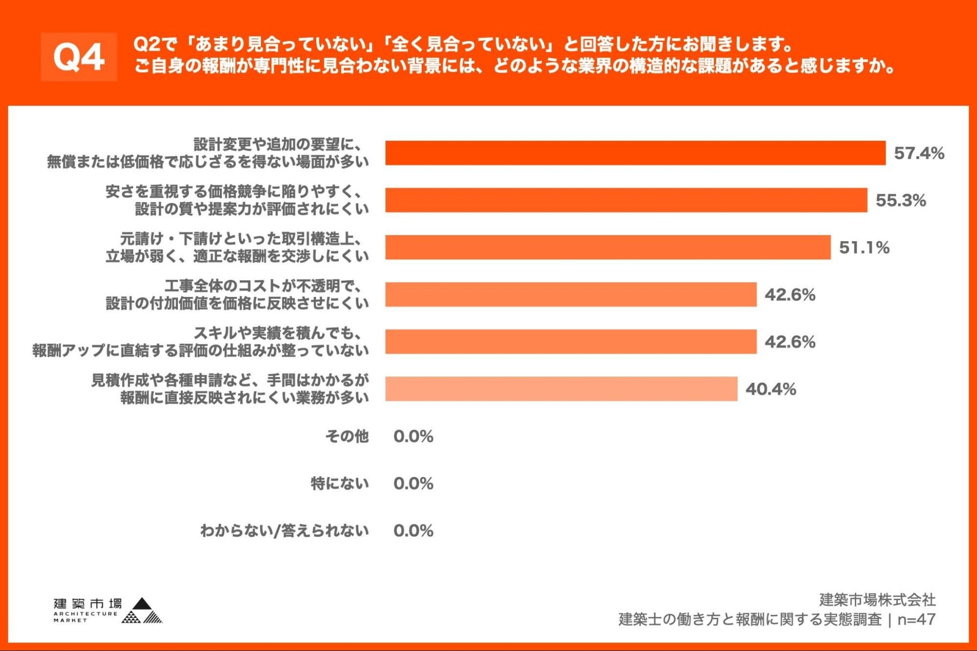 「Q4. Q2で「あまり見合っていない」「全く見合っていない」と回答した方にお聞きします。ご自身の報酬が専門性に見合わない背景には、どのような業界の構造的な課題があると感じますか。(複数回答)」(n=47)と質問したところ、「設計変更や追加の要望に、無償または低価格で応じざるを得ない場面が多い」が57.4%、「安さを重視する価格競争に陥りやすく、設計の質や提案力が評価されにくい」が55.3%、「元請け・下請けといった取引構造上、立場が弱く、適正な報酬を交渉しにくい」が51.1%という回答となりました。