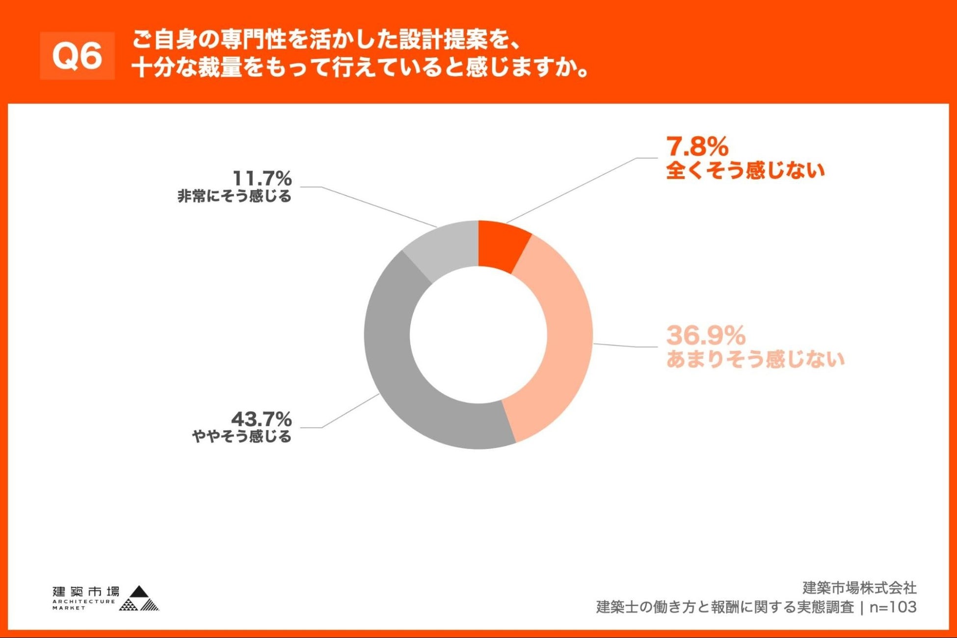 「Q6. ご自身の専門性を活かした設計提案を、十分な裁量をもって行えていると感じますか。」(n=103)と質問したところ、「全くそう感じない」が7.8%、「あまりそう感じない」が36.9%という回答となりました。