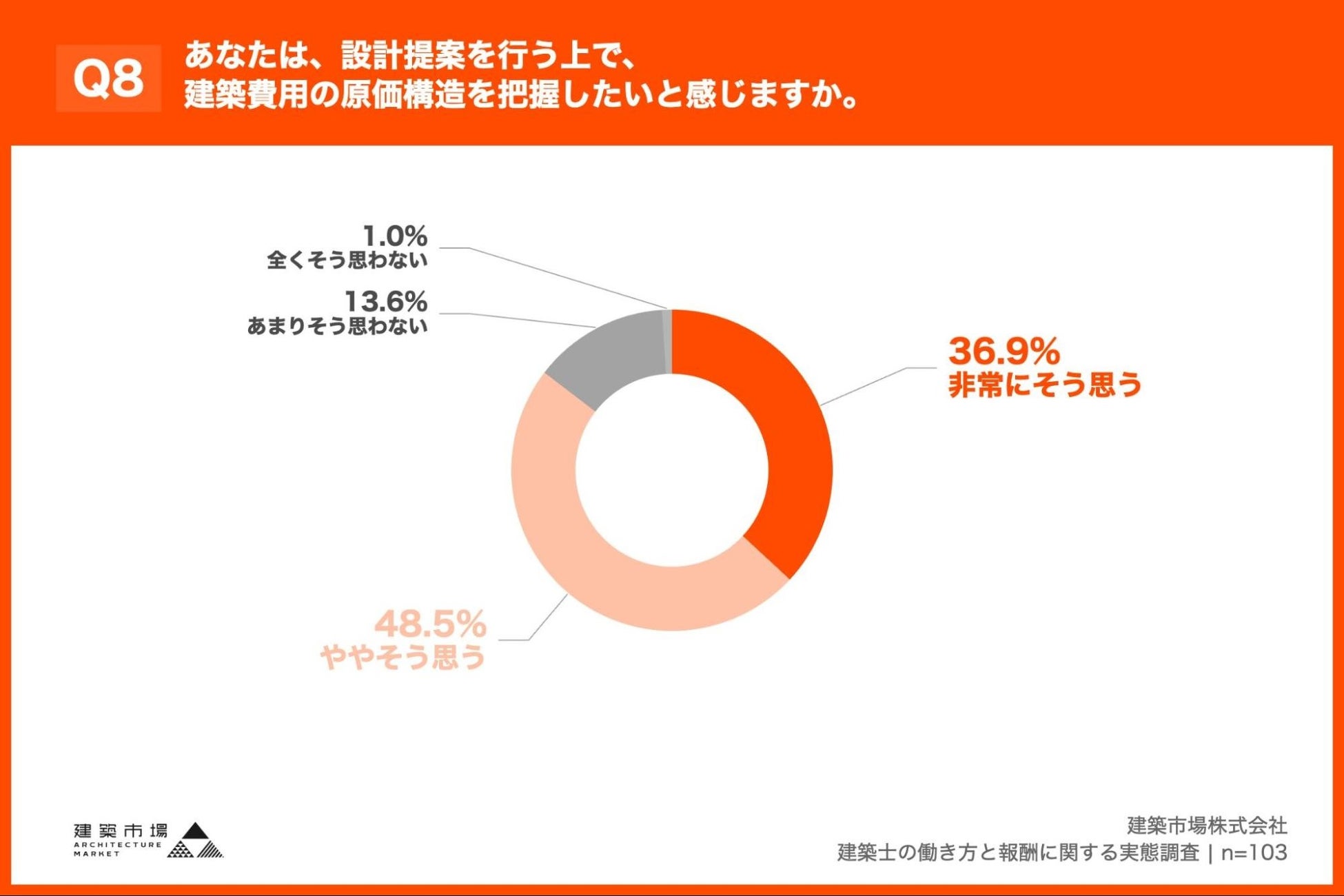 「Q8. あなたは、設計提案を行う上で、建築費用(資材・施工費など)の原価構造を把握したいと感じますか。」(n=103)と質問したところ、「非常にそう思う」が36.9%、「ややそう思う」が48.5%という回答となりました。