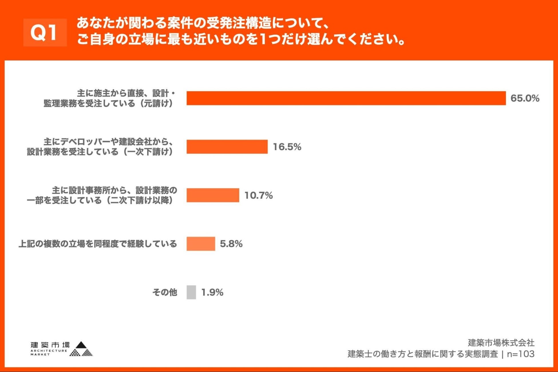 「Q1. あなたが関わる案件の受発注構造について、ご自身の立場に最も近いものを1つだけ選んでください。」(n=103)と質問したところ、「主に施主から直接、設計・監理業務を受注している(元請け)」が65.0%、「主にデベロッパーや建設会社から、設計業務を受注している(一次下請け)」が16.5%という回答となりました。