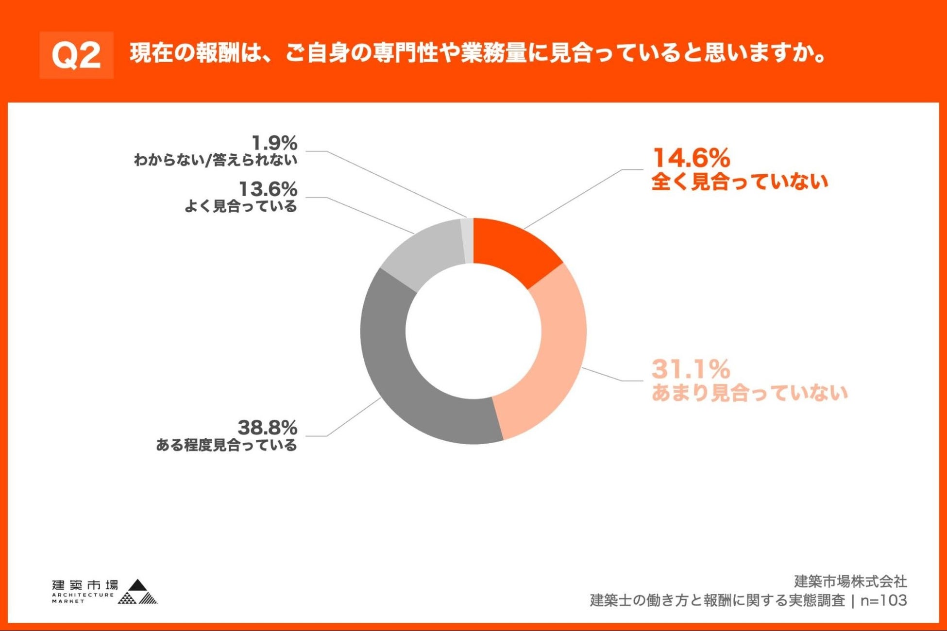 「Q2. 現在の報酬は、ご自身の専門性や業務量に見合っていると思いますか。」(n=103)と質問したところ、「全く見合っていない」が14.6%、「あまり見合っていない」が31.1%という回答となりました。