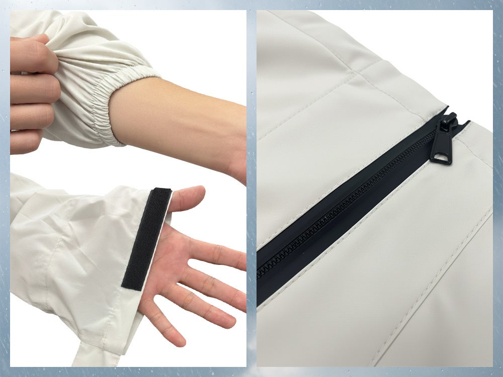 フロントには止水ファスナーを配置し、雨水の侵入をブロック。袖口はリブとマジックテープを組み合わせた二重設計で、フィット感を高め、隙間からの雨を防ぎ快適な着用感を実現します。