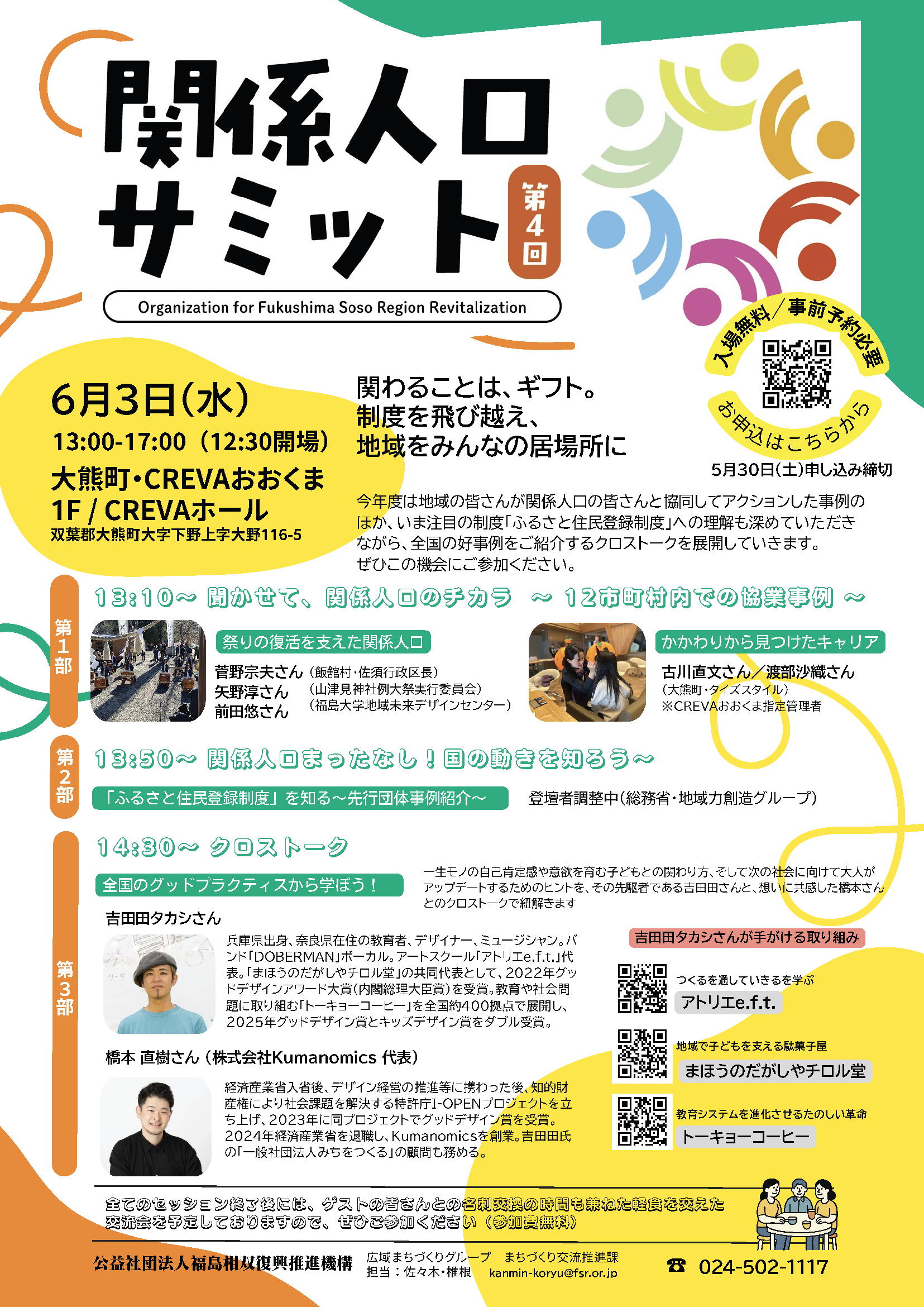 株式会社Kumanomics(本社:東京都世田谷区)代表の橋本直樹は、公益社団法人福島相双復興推進機構(福島相双復興官民合同チーム)が2026年6月3日に福島県双葉町大熊町に開催する第4回『関係人口サミット』にて、去る2025年12月に顧問に就任した「一般社団法人みちをつくる」代表吉田田タカシ氏(アトリエe.f.t.代表/まほうのだがしやチロル堂 共同代表/教育者・デザイナー)とともに、クロストークにゲストとして出演する。